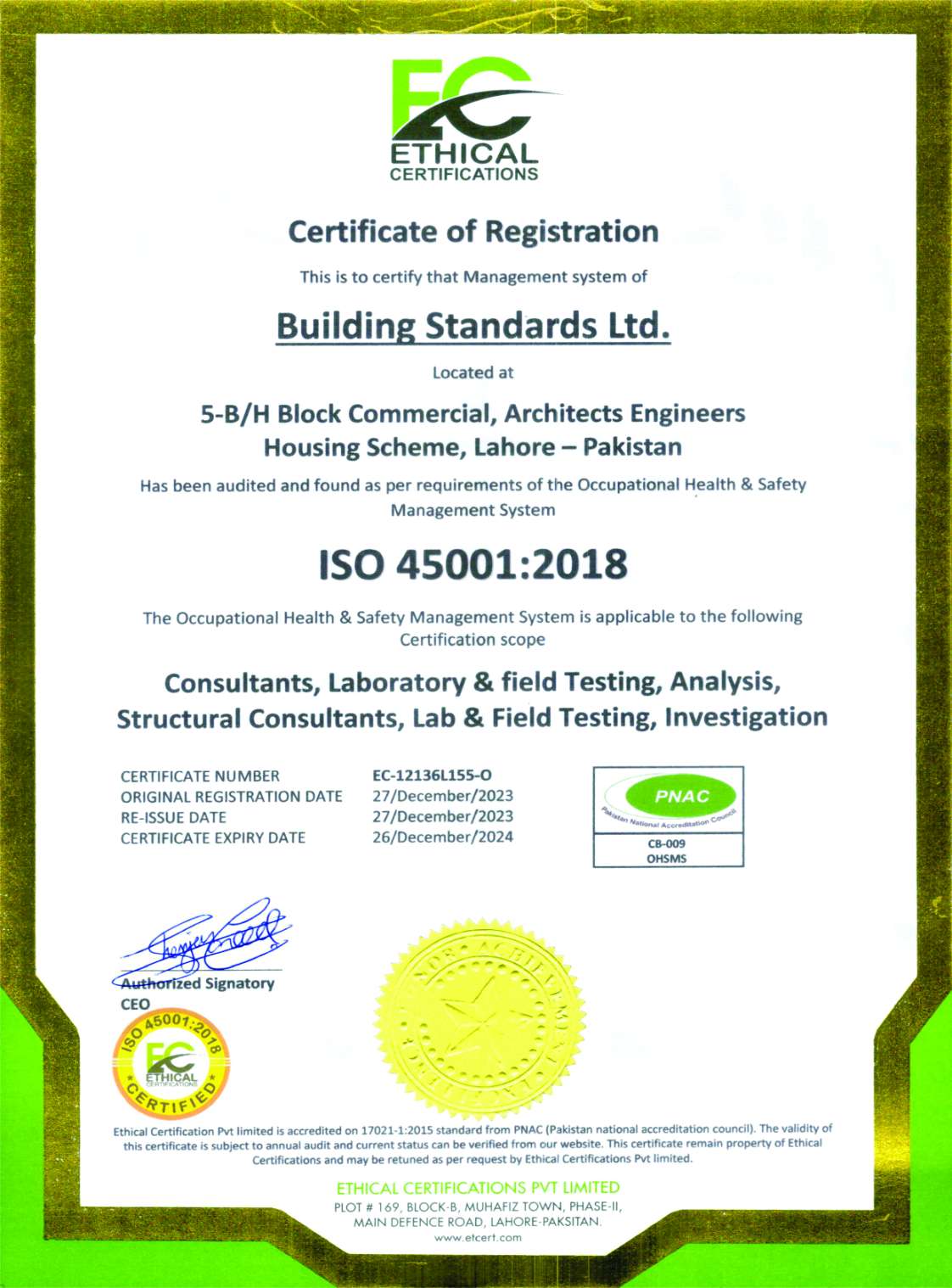 Building Standards Limited is now ISO 45001:2018 certified for Consultants, Laboratory & field Testing, Analysis, Structural Consultancy, and Investigation services, ensuring occupational health & safety compliance in Pakistan.